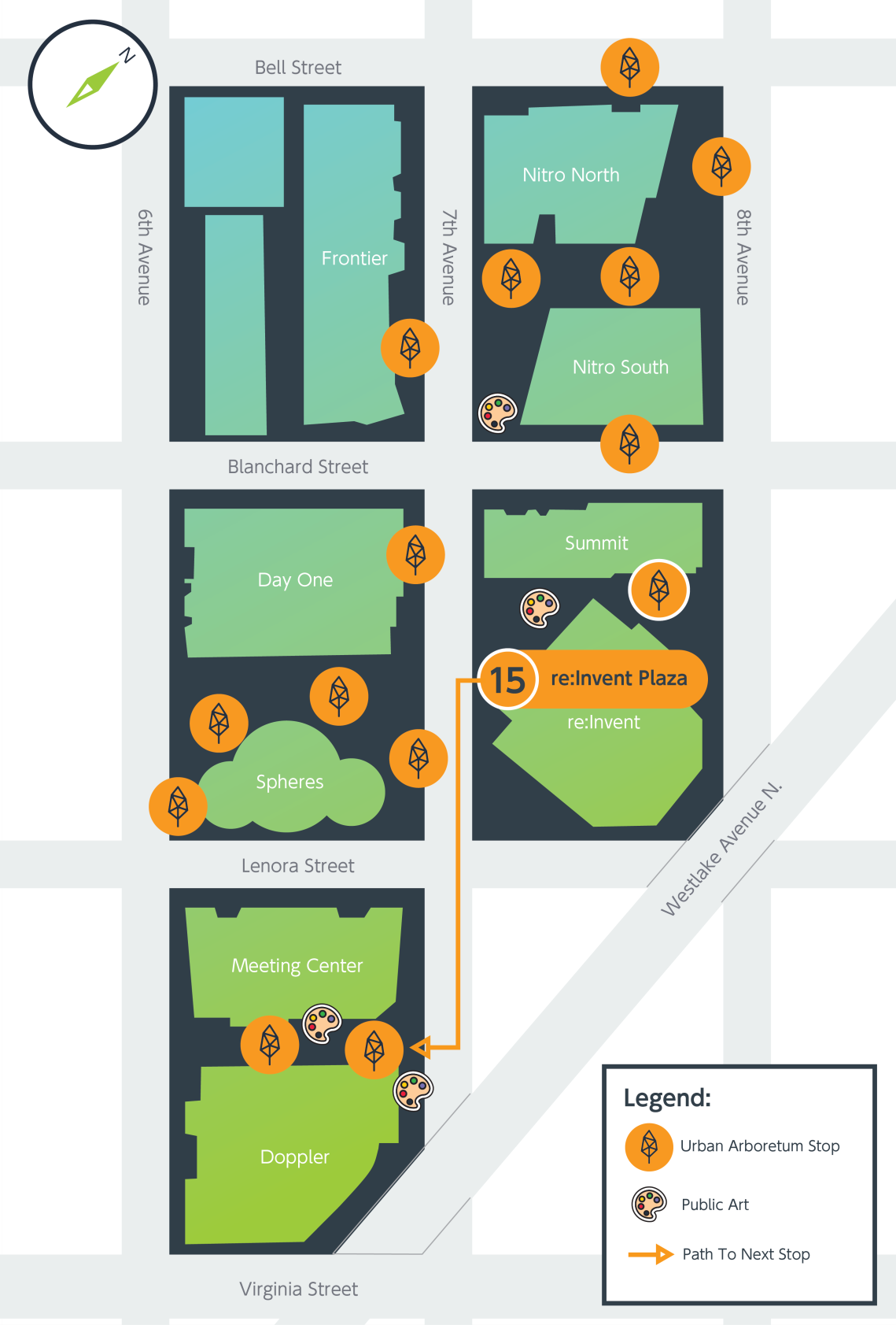 Continue strolling the re:Invent Plaza and you will come across this landscape on 7th Ave and Lenora. Click on a photo to learn more.