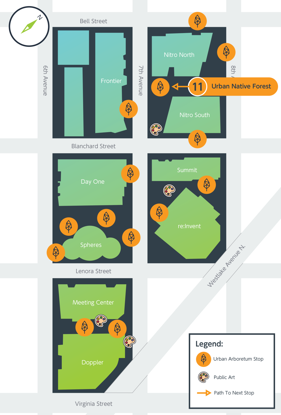 Welcome to the Urban Native Forest, a unique urban ecosystem containing plants native to the Cascadia region of the Pacific Northwest, ranging from Northern California into Canada.